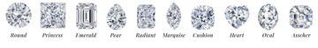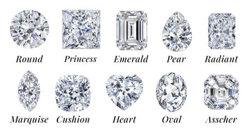 Diamond shape refers to its geometric appearance and is categorized into round and fancy shapes. Round is the most traditional, while fancy shapes include Princess, Emerald, Pear, Radiant, Marquise, Cushion, Heart, Oval, and Asscher.