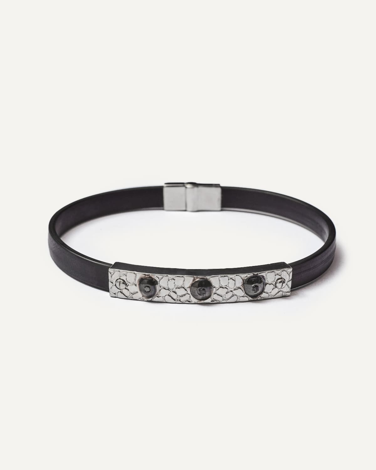 Elevate your style with the Triple Eclipse Bracelet, featuring three striking black diamond stones set in a comfortable rubber strap. Symbolizing balance, strength, and contemporary elegance, this bracelet seamlessly combines luxury and practicality, perfect for those who seek a modern and sophisticated look.